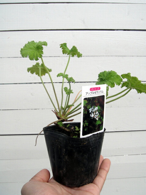 アップルゼラニウムは原種の一つで、ちぢれた丸い葉にアップルの香りが楽しめます。