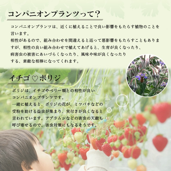 | 庭植え、鉢植え、花壇、コンパニオンプランツ(イチゴ・ベリー類)など |