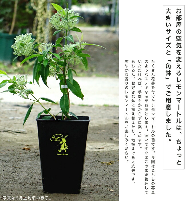 サイズもやや大きくて見応えのあるハーブ苗「レモンマートル」が入荷して参りました。魅力は何と言っても「葉っぱ」です。シトラールという成分が含まれているため、葉っぱがレモンのようなシトラスの香りがします。寒さは少し苦手ですが、冬の間は室内で管理するば通年で楽しむこともできます。最近の定番「角鉢苗」に植え替えてお届けさせていただきますので、観葉植物として葉を楽しみながら、お部屋の空気をキレイで爽やかにしてくれます。