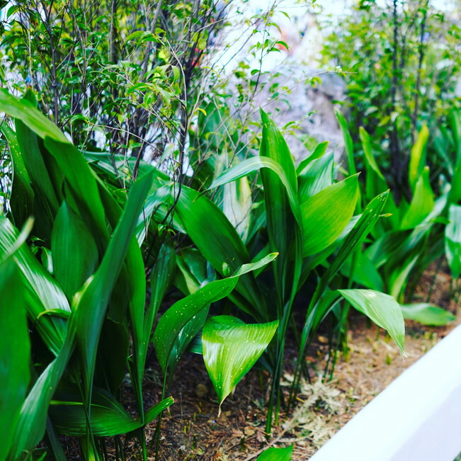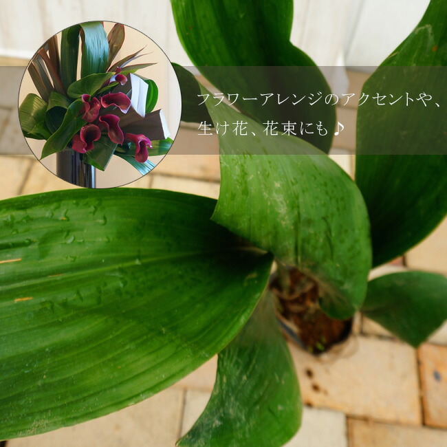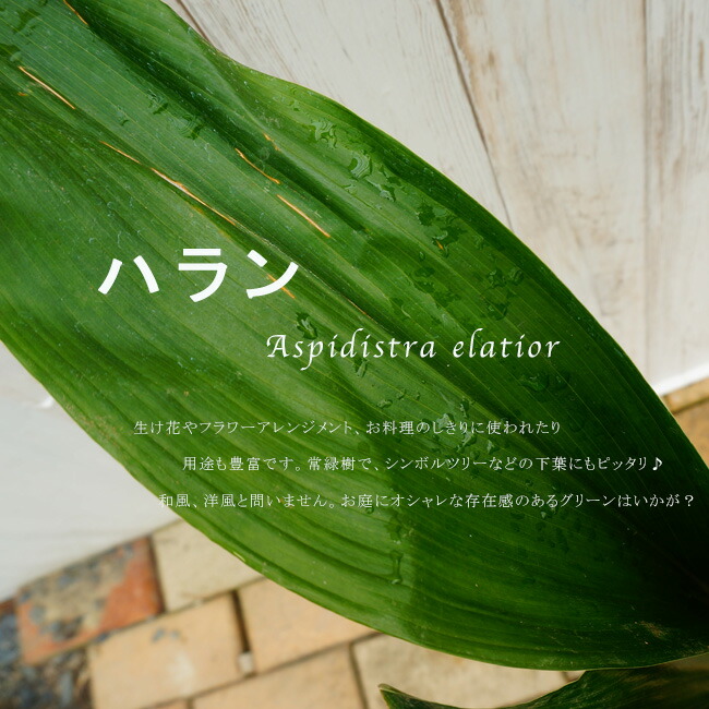 ハラン(葉蘭)は、常緑樹の下や北側の日陰でもよく育ち、庭で親しまれています。 葉には殺菌作用があるので、料理の仕切りなどに添えられることがあります。 生け花やフラワーアレンジメントにもよく利用されます。