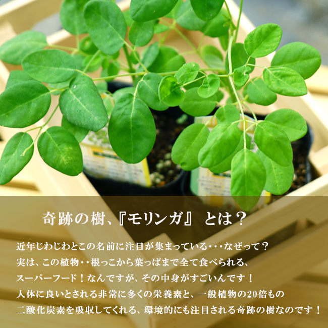 こんなすごいミラクルツリー「モリンガ」が、なんと当店初登場!しかも小さい苗木なので、。モリンガは成長がすごく早いので、あっという間に大きくなります。寒さにとても弱いので、鉢植え栽培をお勧めします。(国内では1年草扱いが多いようです)