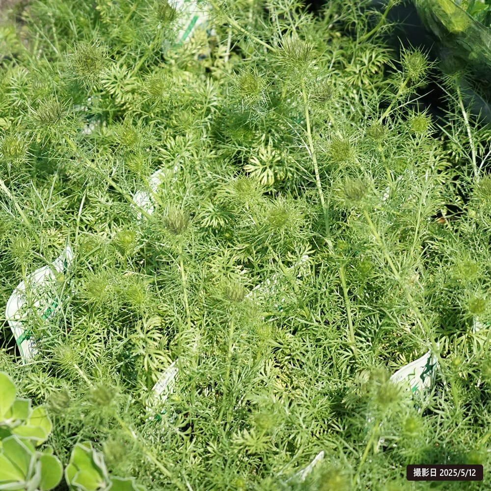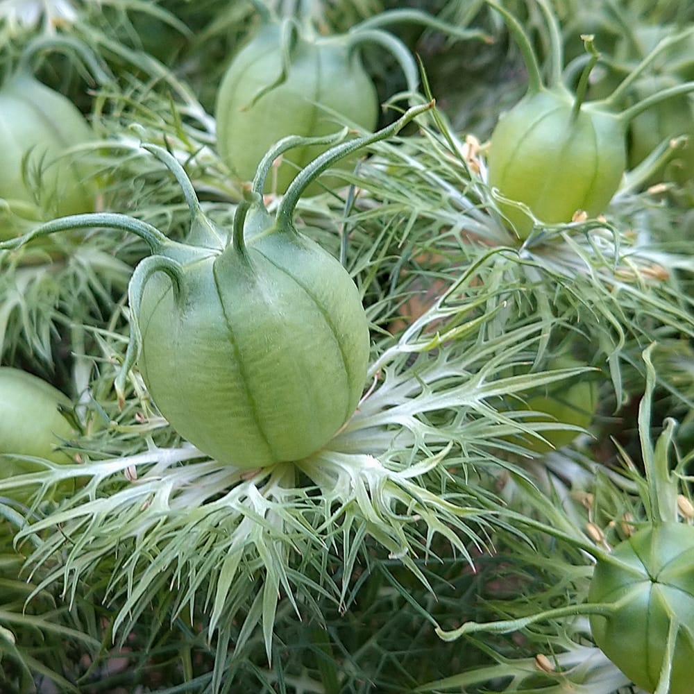 「ニゲラ」は黒種草の学名です。その名の通り、花後に結実して黒い種子を付けます。種子にはバニラのような芳香があり、果実が大きくなったころにドライフラワーに仕立てても素敵です。