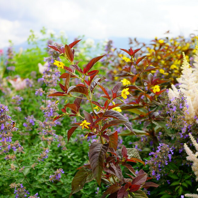 赤紫色の葉はカラーリーフとして庭を彩ります。花のない時期も美しいです。夏に黄色い小花を咲かせます。