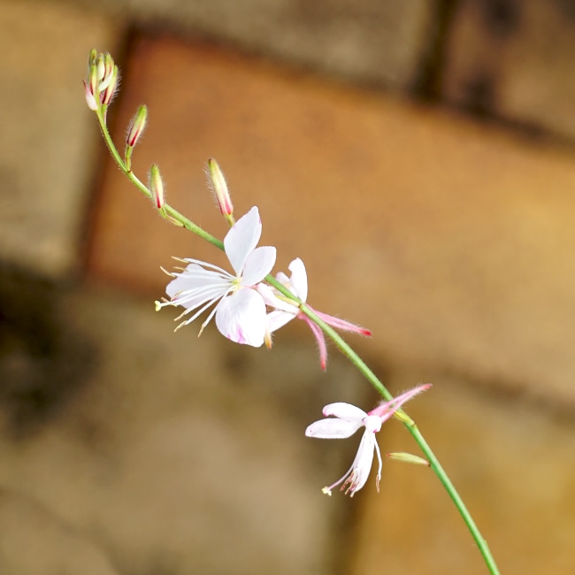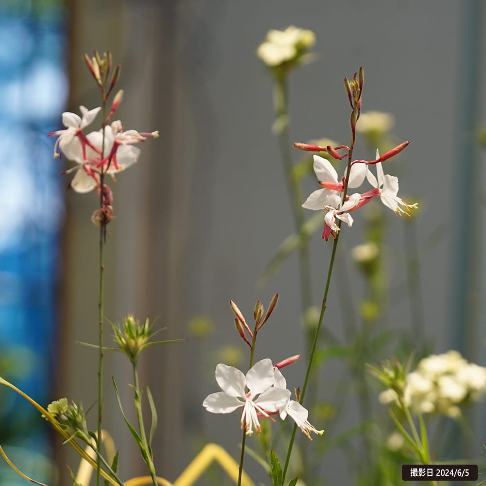 ガウラはアカバナ科の宿根草で北米大陸が原産。和名は蝶が飛んでいるように見ることから「白蝶草(はくちょうそう)」と呼ばれます。細い茎の先に咲く花は風にゆられて蝶が飛び回るような姿に見えます。
