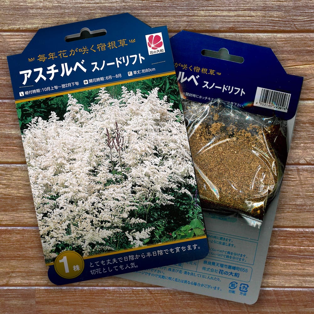 アスチルベ スノードリフトは「雪の漂流、吹き寄せ」という意味でその名のごとく純白の花穂です。初夏にほうき状の花穂を伸ばして繊細な花を咲かせます。切花としても大変人気です。細かい葉も美しく、カラーリーフでの観賞価値も高いです。山野草のような自然な風合いになります。