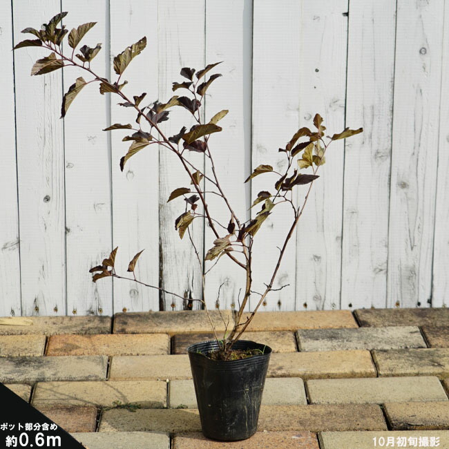 アメリカテマリシモツケ ディアボロは、北アメリカ原産で、葉が紫色なのが最大の特徴です。落葉低木の中でも赤紫色の芽出しは特にキレイです。夏~秋頃にはやや暗い色になり、遠目で見ると黒っぽく見えます。ディアボロという名前ははラテン語で「悪魔」の意味なので、ちょっと響きが物騒ですが、暗紫葉も美しく、花はかわいく、花の後には赤い実がつき庭を彩ります。