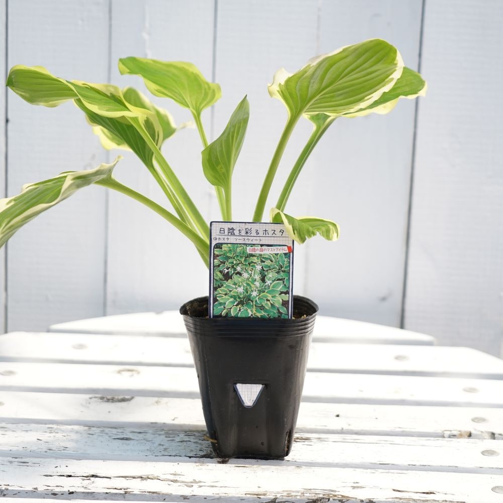「ソースイート」は、夏に咲く白い芳香花と斑入りの涼やかな葉が清楚な雰囲気を演出する可憐なホスタです。葉が細かく密生して育つため省スペースでも大丈夫。フラグラントブーケの交配種です。