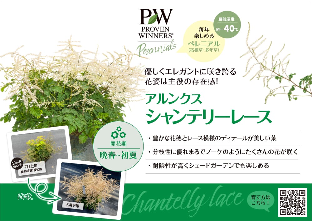 アルンクス「シャンテリーレース」は北アメリカ原産の多年草です。日本の高温多湿の環境に適しており根づけば植えっぱなしでも大丈夫なローメンテナンスな植物。耐陰性に優れており日陰でも花を咲かせ、よく育ちます。シェードガーデンの楽しみ方が膨らむお花です。