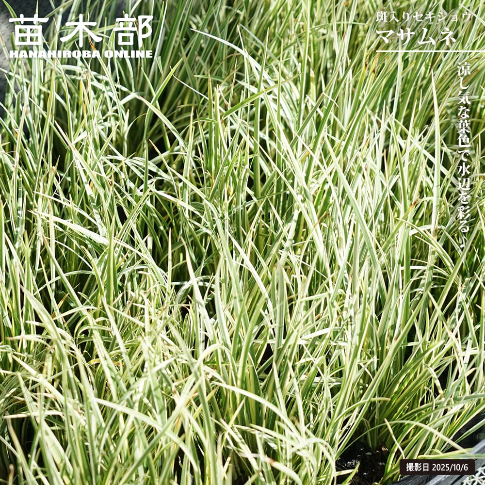 正宗石菖(マサムネ)は斑入り姫石菖(セキショウの矮性品種、草丈は10~20cmくらい)で、斑入りの通常種よりもはっきりと葉に白い斑が入り、美しいです。池や川の近くで見られる常緑多年草です。