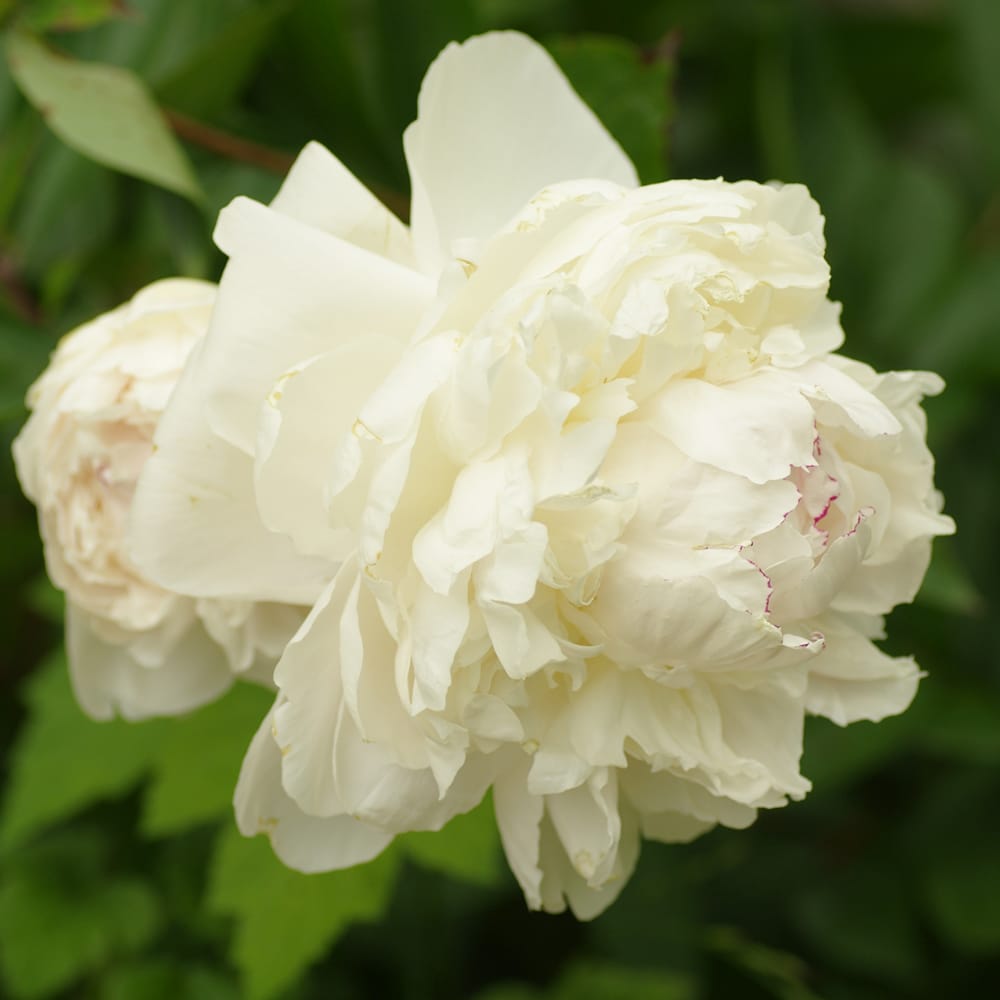 ラテンドールは純白に中心部の花弁の縁に赤が入ります。バラ咲きの大輪咲きです。花立ちが良いので切り花でもポピュラーな品種で、花壇にもおすすめです。白系のシャクヤクは中心部の花びらに赤いスジが出たり、全体にややピンク色を帯びることがあります。これは開花するまでわかりません。個体差や環境の影響もあります。ラテンドールの香りは甘さのあるさわやかな香りで、ややしっかりめに香ります。繊細な花びらがふわりと咲き開く姿は、とても優雅です。