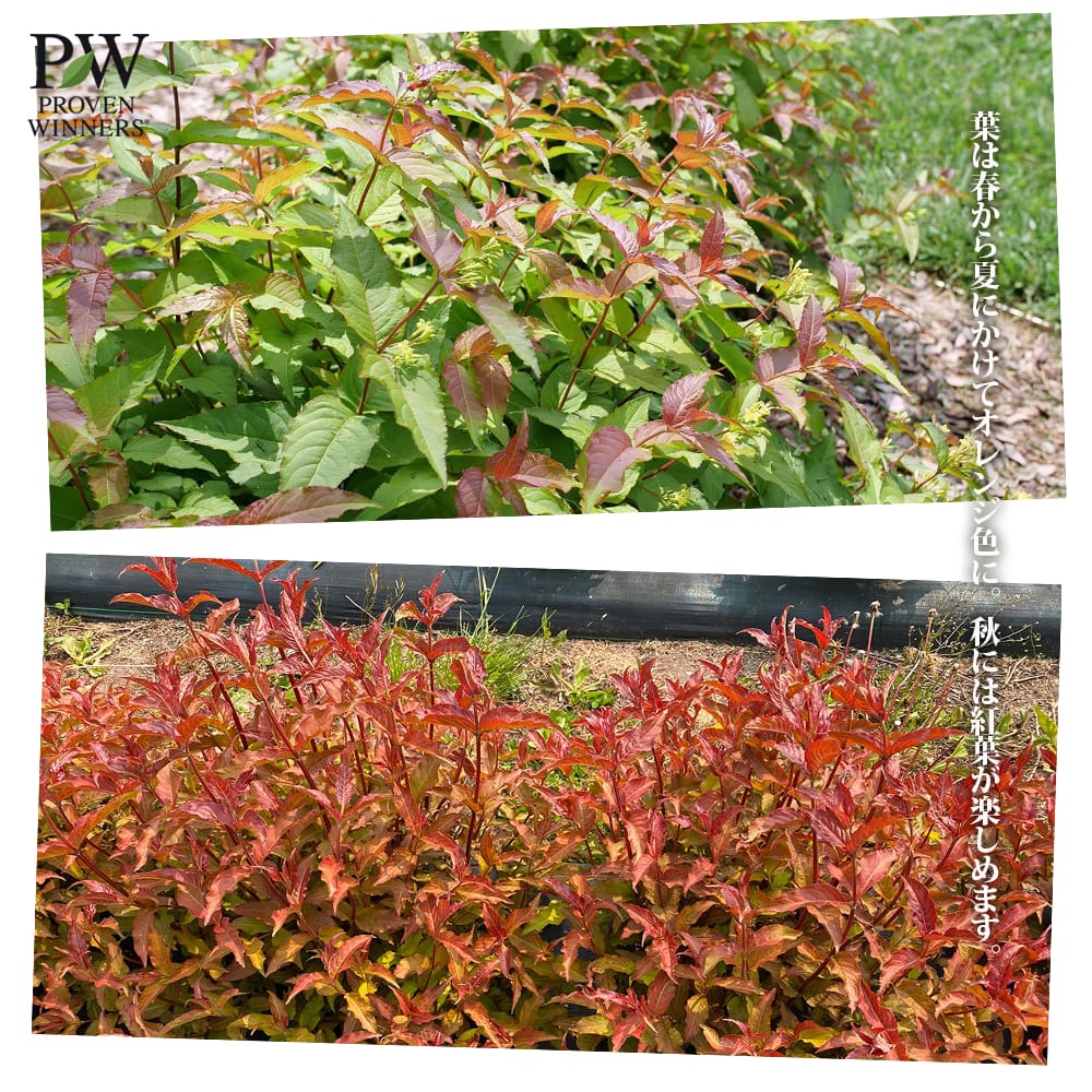 「ビーハッピー」はアメリカの蜜源植物で、春から夏にかけては葉がオレンジやバーガンディー色・濃い紫色と品種によって異なるカラーを楽しめます。樹形はコンパクトにまとまり、半日陰でも場所を選ばず育てられる優れもの。病害虫にも強く、非常に強健で手間がかからない植物です。