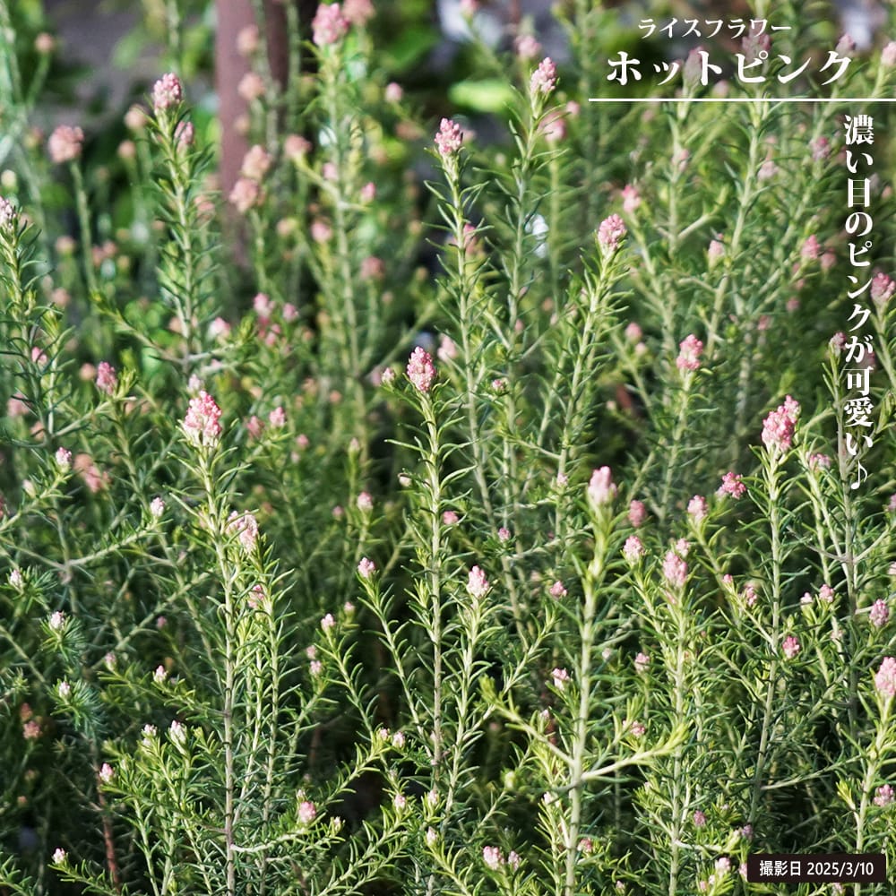 「ライスフラワー」は小さな蕾が米粒のように見えることから命名されました。蕾のうちはやや花色が濃い目ですが咲き進むにつれて色が白くなります。開花期間が長く花もちも良いことから、切花やドライフラワーとしても人気です。オーストラリア原産の植物ですので日本の夏の多湿や冬の寒さが苦手なので、鉢植えで管理したほうが良いでしょう。適宜剪定を行うと枝がよく分岐し