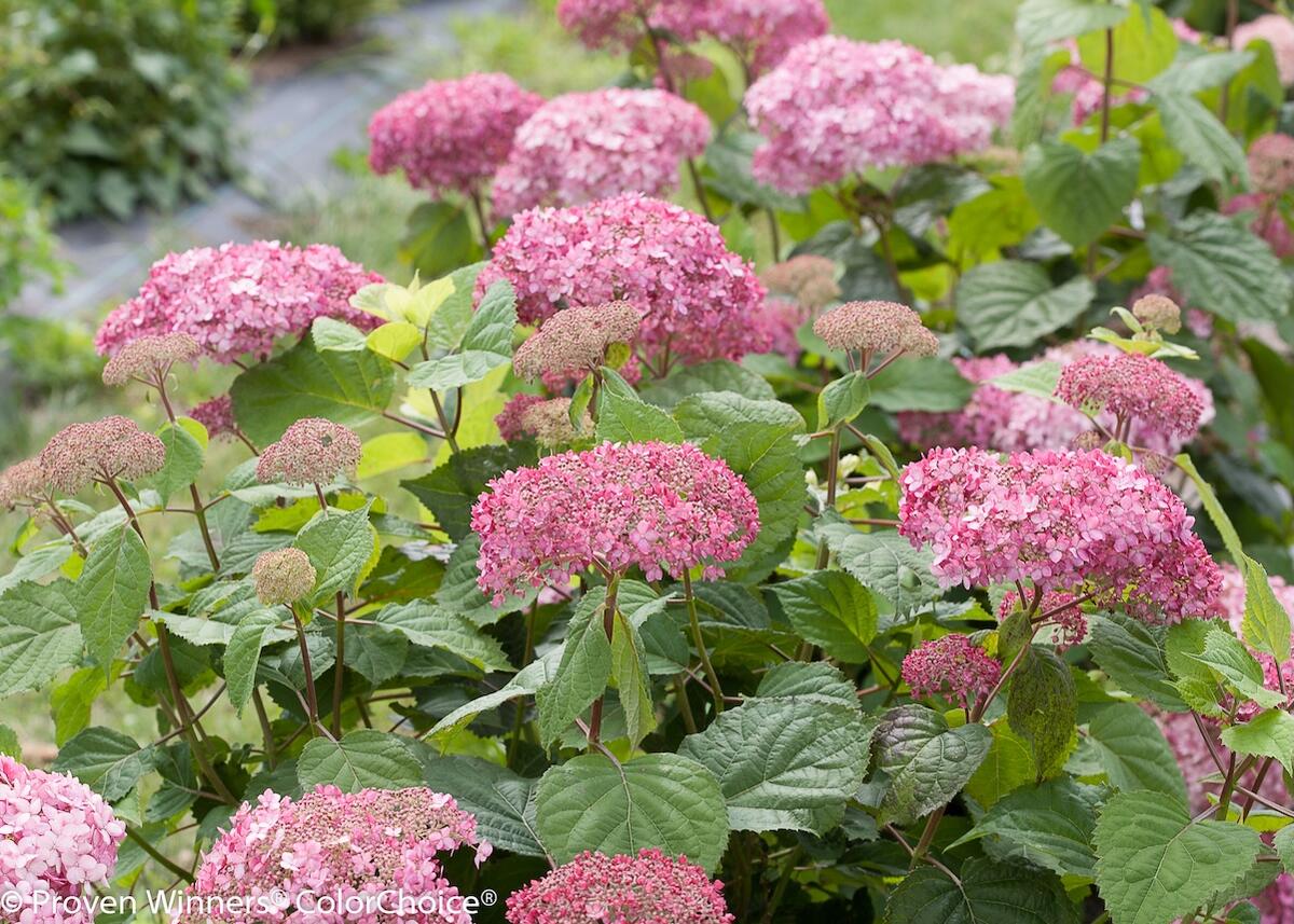 アナベル「ミディ ピンク」は花色の変化が美しいアナベルです。最初は鮮やかなピンク色、やがて柔らかなピンク色へ、咲き終わりにはグリーンへと変化します。ピンクのアナベルの改良品種で、花の色葉の色がより深く濃い色になり、繰り返し咲く性質がさらに強くなりました。