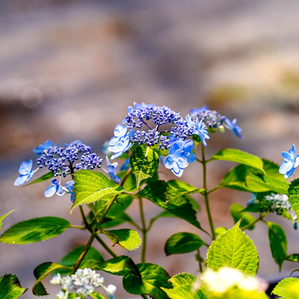 ヤマアジサイは本州では関東より西、また四国、九州などの山地にみられます。湿り気のある山地などに生育しているため、半日陰の環境を好みます。日当たりの良すぎる場所は避けてください。ガクアジサイよりも葉が細く、産毛があり、薄く、光沢がありません。別名”サワアジサイ”とも言います。ヤマアジサイは西洋アジサイに比べ生育が比較的遅いことから、病気と思われがちですが、この品種の性質からくるものです。