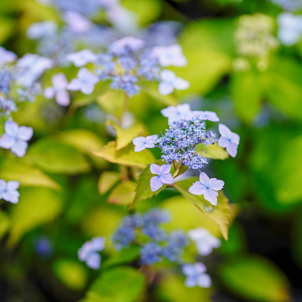 ヤマアジサイは本州では関東より西、また四国、九州などの山地にみられます。湿り気のある山地などに生育しているため、半日陰の環境を好みます。日当たりの良すぎる場所は避けてください。ガクアジサイよりも葉が細く、産毛があり、薄く、光沢がありません。別名”サワアジサイ”とも言います。ヤマアジサイは西洋アジサイに比べ生育が比較的遅いことから、病気と思われがちですが、この品種の性質からくるものです。