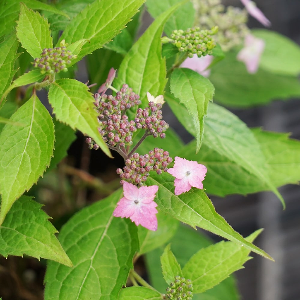 装飾花の花色は、薄赤紫色と青の虹系で、切れ込みのある十字咲きです。ガク片の先が鋭く尖り、縁には鋸歯があります。株も花房も小型な品種です。