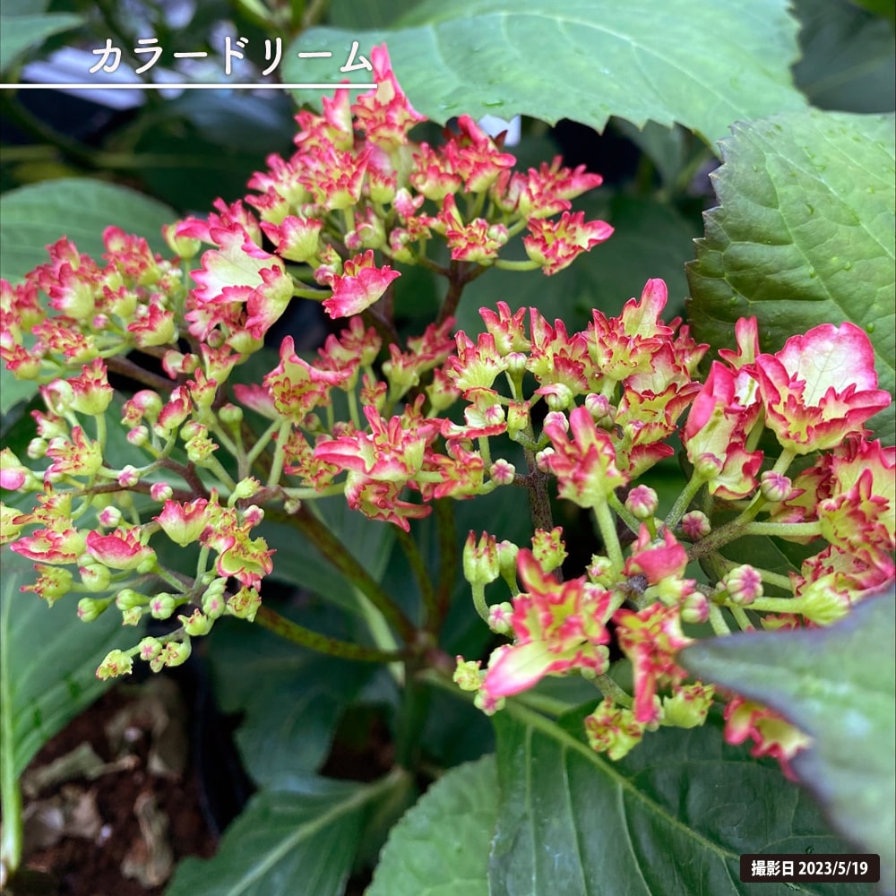 「カラードリーム」は、花弁がギザギザになりフリルのように波打つためとても華やかな印象を与えます。白からクリーム色の花弁に、赤紫色の縁取りが入り清楚な雰囲気もあります。咲き始めは白い部分は緑色で、咲き進むにつれて白くなり、アンティーク感あふれるアキイロアジサイへシフトしていきます。