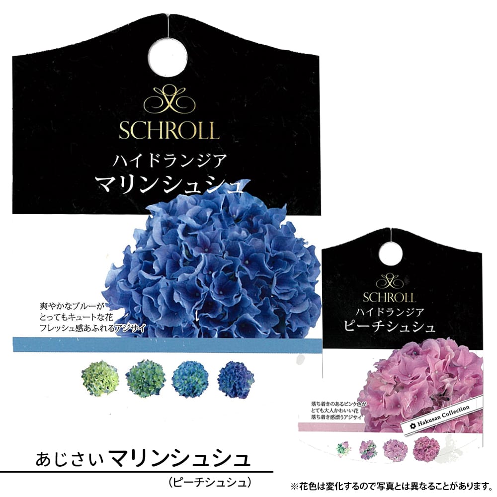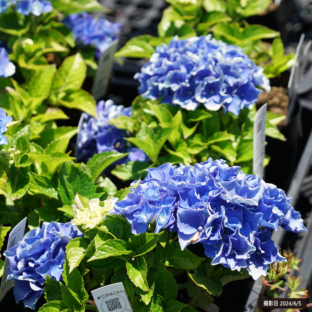 「マリンシュシュ」は、鮮やかなブルー色のハイドランジア。枝が強いため花房の重みで枝が曲がりにくい品種です。ピンクに発色したマリンシュシュは「ピーチシュシュ」の名で販売されています。