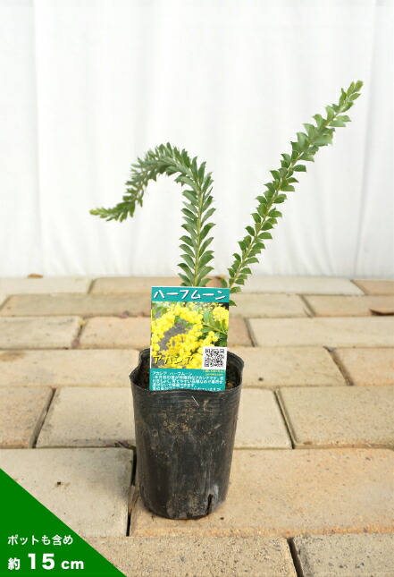 ハーフムーンは、サンカクバアカシアに似た半月状の葉が特徴的なアカシアです。花もよく咲き、育てやすいので場所を選ばず育てることができます。花色はやや輝黄色で甘い香りがします。成長も早いです。地際から株立ち状に生長します。普通のアカシアとはちょっと異なる利用ができますます。半日陰でも育つので下草としても利用もできます。良く枝葉が茂るので目隠しや、生け垣的な利用もおすすめです。強めの剪定も耐えるので小さくコンパクトに管理できます。