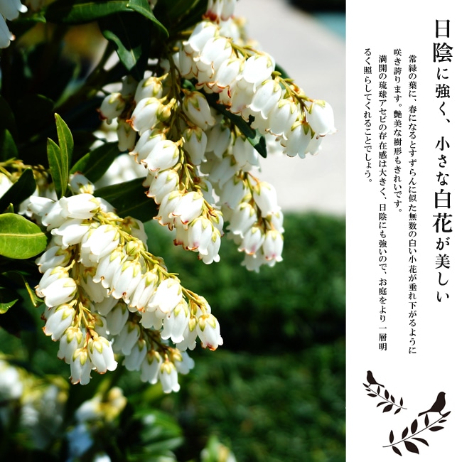 琉球アセビは春にすずらんのようなつぼ形の花を房状にたくさん付けます。満開時期には花が葉を覆うほどに咲き誇ります。新芽の花が咲き始めた頃は少し紅く、満開の頃には真っ白の多数の花がとても美しく目に映ります。花はやや大きめです。それに加えて細い濃緑の葉が他の植物と調和してとても素敵なお庭を演出してくれます。
