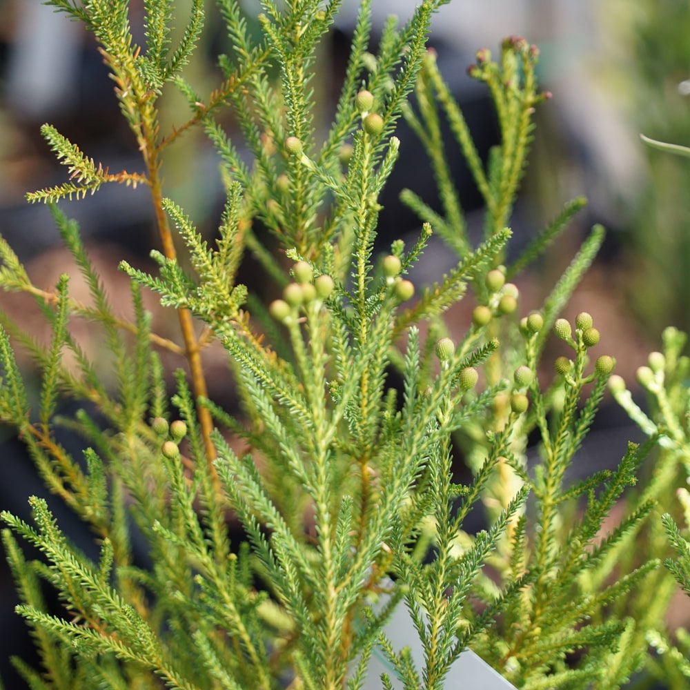 「ケープグリーン」は、杉のような枝葉を持つ個性的なバーゼリア。ギザギザした見た目からはわかりませんが、質感はソフトでふわふわしています。春につける玉状の蕾も可愛いですが、実も真っ赤なグミのような見た目で人目を引きます。香りも良いため、ドライフラワーやリース、スワッグなどにも好んで使われます。やや這い性ですので、花壇の手前に植えるのもおすすめです。