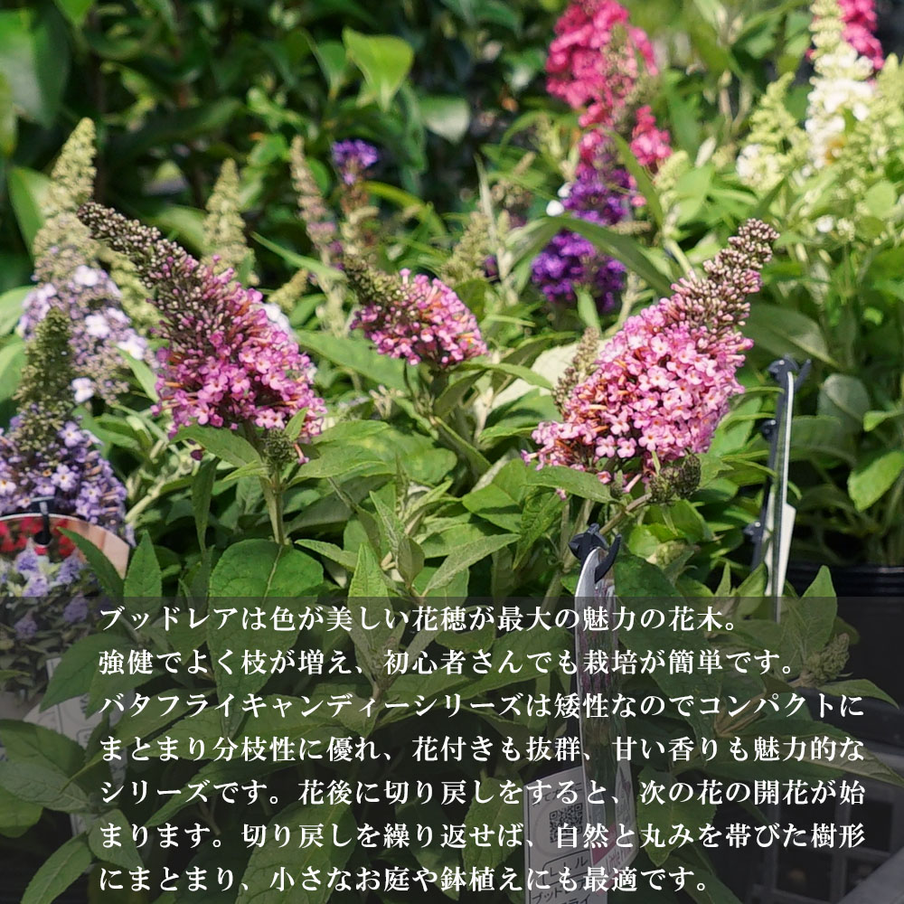 バタフライキャンディーシリーズはコンパクトにまとまり分枝性に優れ、花付きも抜群、甘い香りも魅力的なシリーズです。自然と丸みを帯びた樹形にまとまり、小さなお庭や鉢植えにも最適です。花後に切り戻しをすると次の花の開花が早まります。これを繰り返すとこんもりとした姿になります。