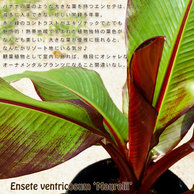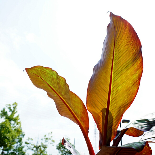バナナによく似た葉をもち、「レッドアビシニアンバナナ」とも呼ばれますが、バナナとは別属の植物で、果実はなりません。