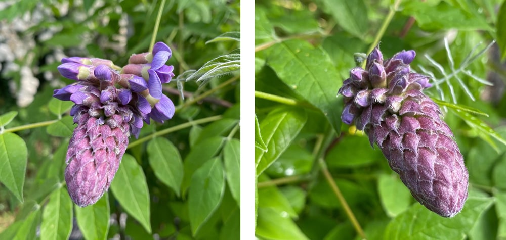 アメジストフォールは、香りのある紫藤色の房状花を夏につける、珍しい藤です。アメリカ バージニア州~フロリダ州の原産地では秋にも咲く2季咲きですが、日本の気候だと春の一季咲きになります。