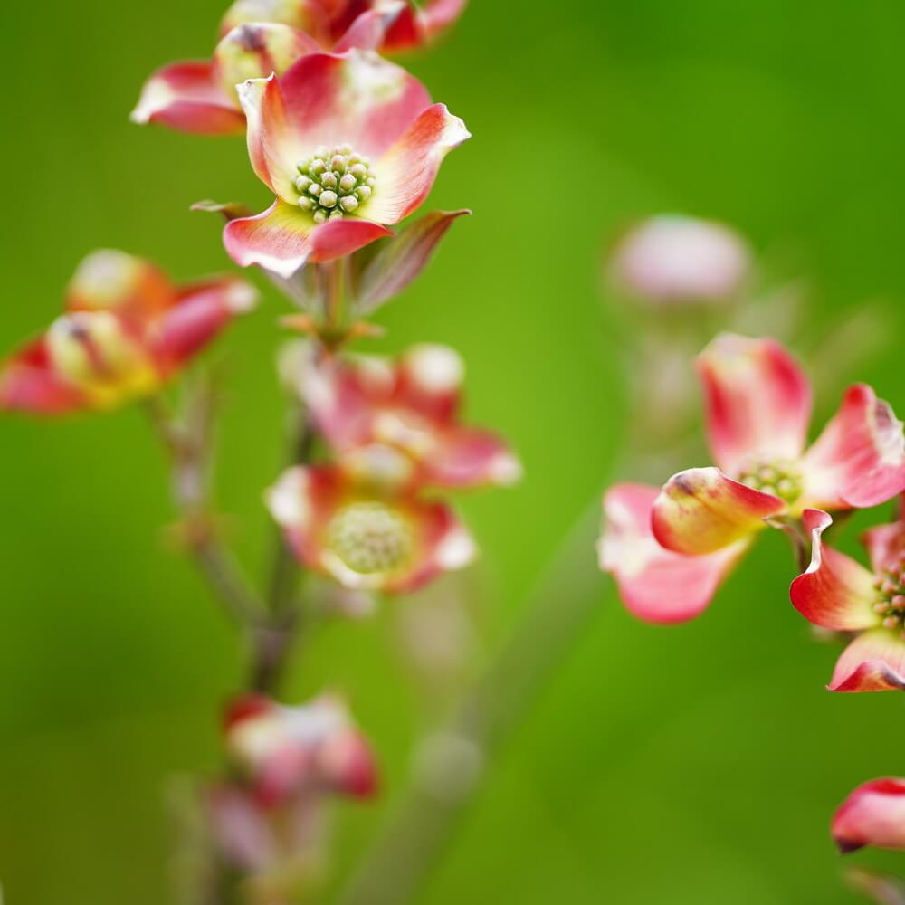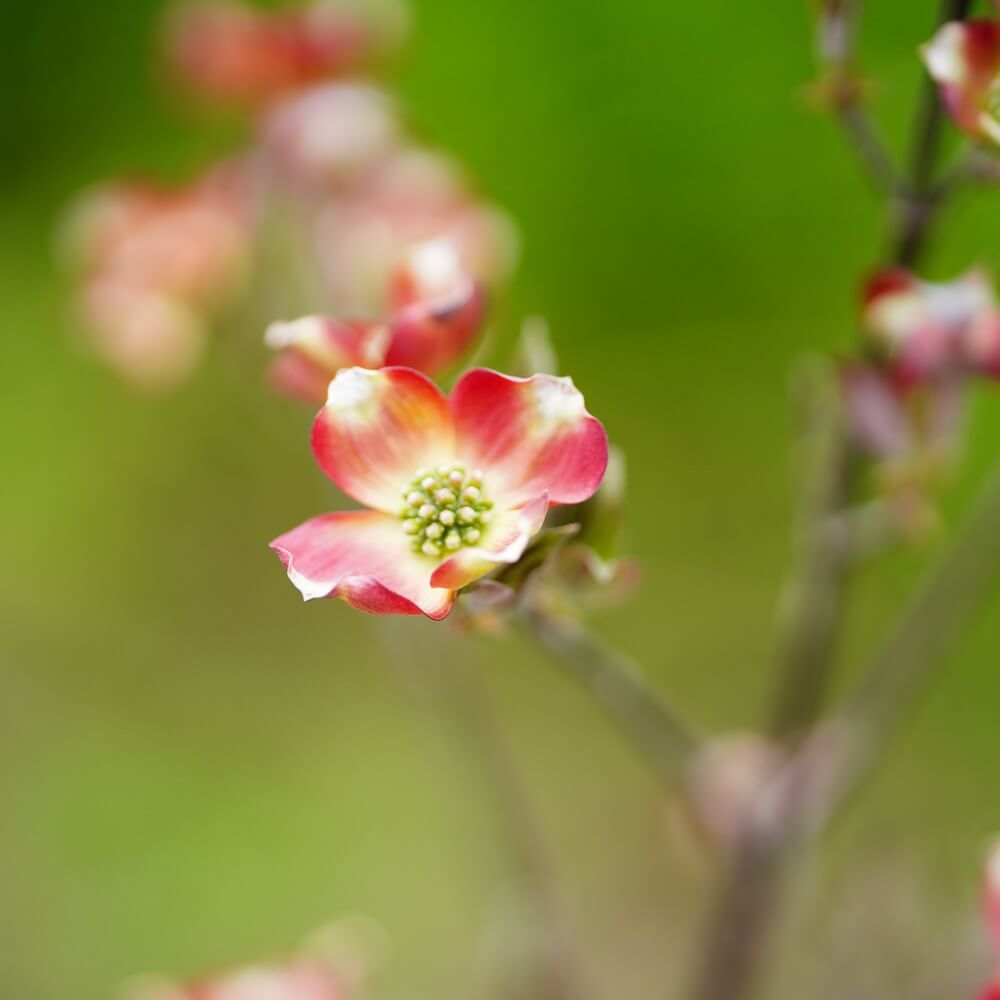ピンク花のジュニアミスと、ベニバナハナミズキ(赤花ハナミズキ)は花色がよく似ています。蕾から開花すると最初は緑黄色かかっている総苞が次第に赤く染まっていきます。(花弁のように見えるのは総苞です。)