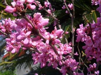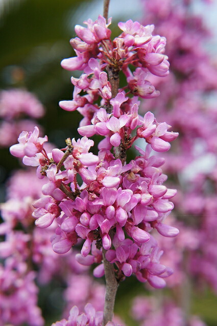 赤花ハナズオウはピンク色~赤紫の蝶のような小花がびっしり咲きます。