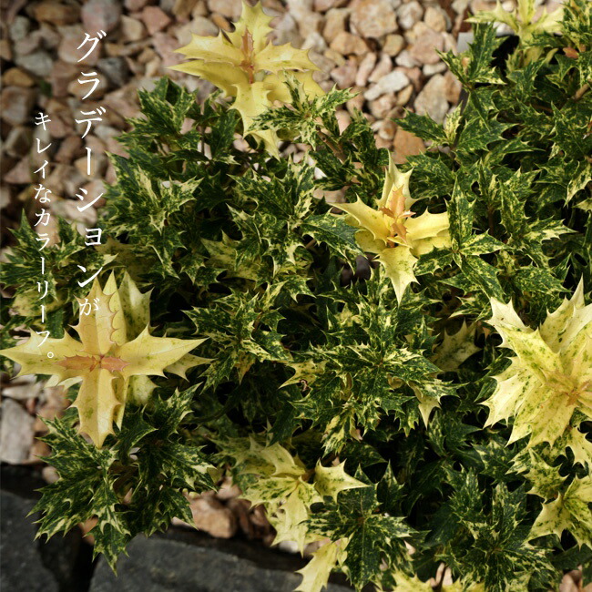 ゴシキヒイラギ(五色柊)は5色となっているものの実際は斑の入り方が様々な葉が散らばってつくので、「明るくてカラフルだよ」の意味で五色と名づいたのではと思います。常緑で年中変わらず美しい葉色です。春先と秋口には新芽が赤く色付きグラデーションがとても綺麗です。葉色は花に勝るほど美しく、クリスマスリーフや寄せ植えにも使われています。黄色~クリーム色の斑入りで洋風によく合います。防犯に効果的な生垣樹です。白い小さな花が咲きます。