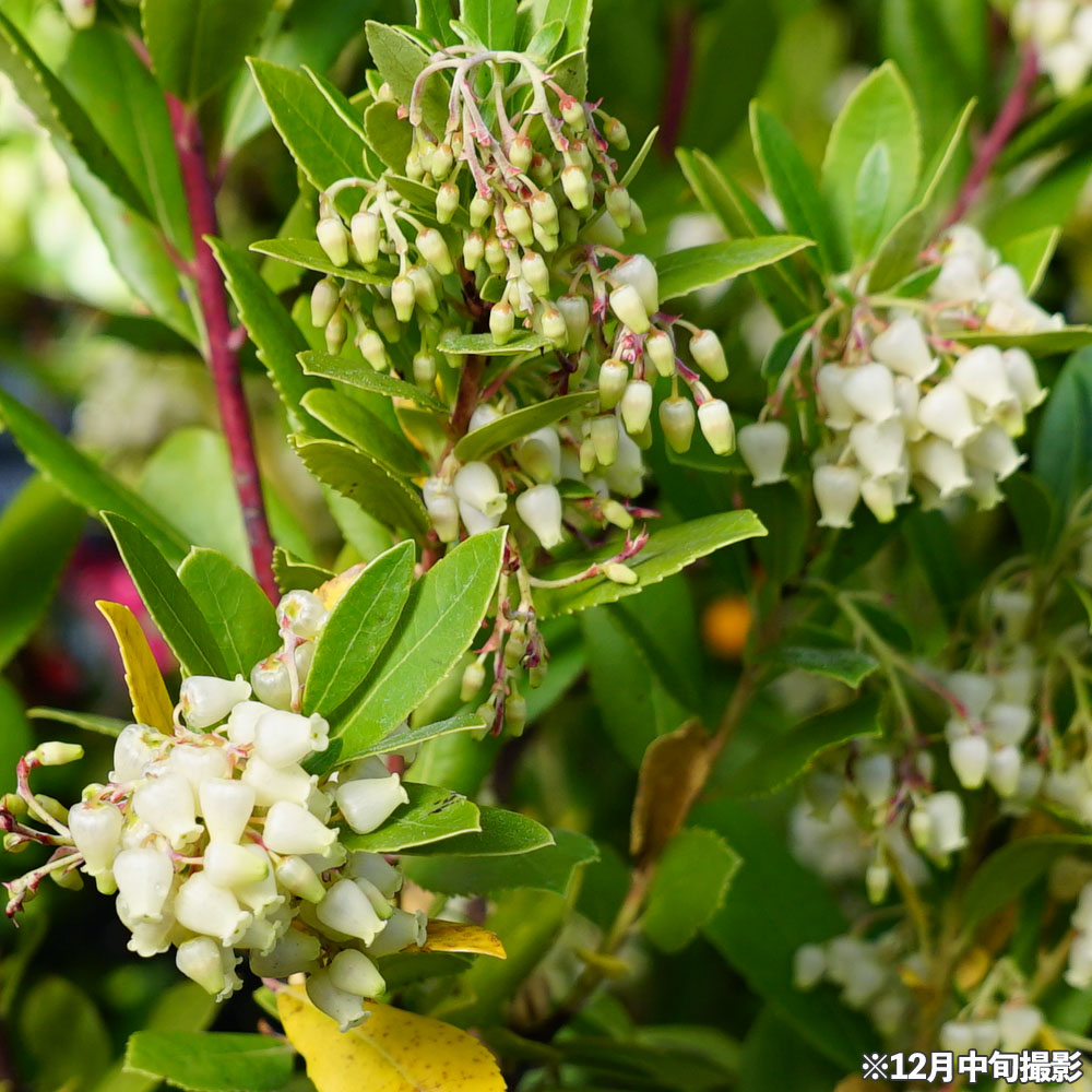 大きくなりにくい矮性のイチゴノキ。こちらの品種は、可愛らしい白花が楽しめます。成長が遅く病害虫にかかりにくいため、手入れがいらない庭木です。