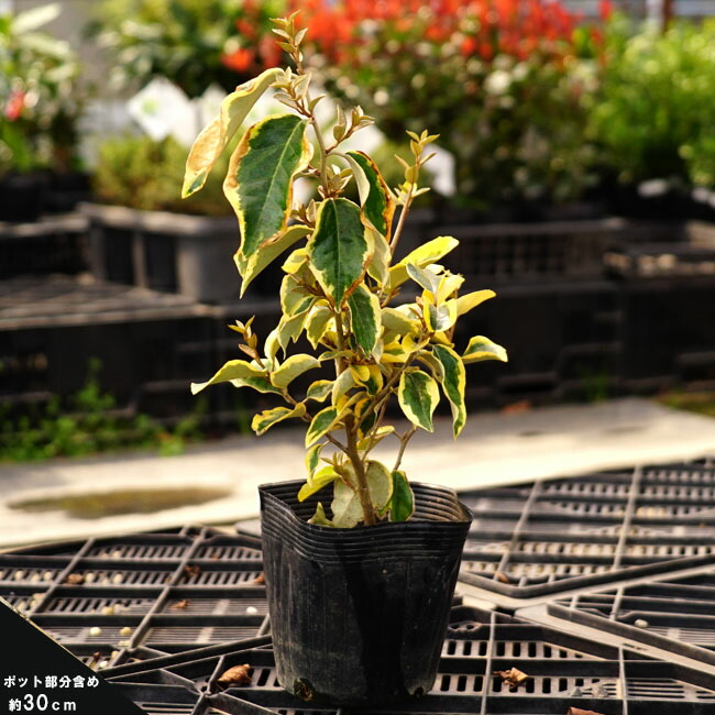 「常緑グミ 斑入りギルドエッジ」は、鮮やかな黄色の外斑が美しい、明るい葉色です。、植木の下草やグランドカバーとして、刈り込んで樹形を仕立てたり、生垣に用いたりと用途は多様です。