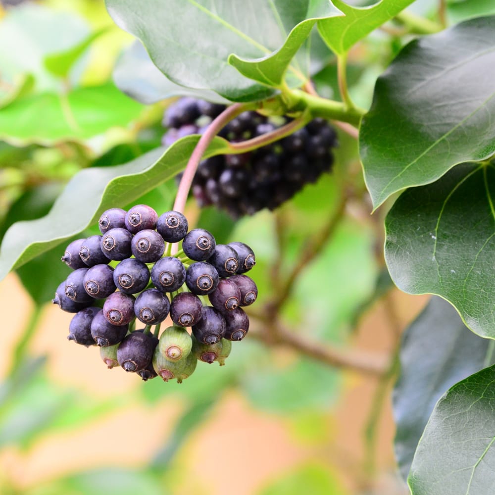 天狗が隠れるカクレミノです。木が成長して成木になると切れ込みのない葉が出てくるようになったり、古い葉が秋に紅葉することもあります。成長とともに葉が変化していく楽しさがあります。葉の色は深めの緑色でやや分厚いです。表面に光沢があります。夏に黄色い花が咲きますが、小さすぎて観賞価値はありません。花後に黒紫色の果実がつきます。