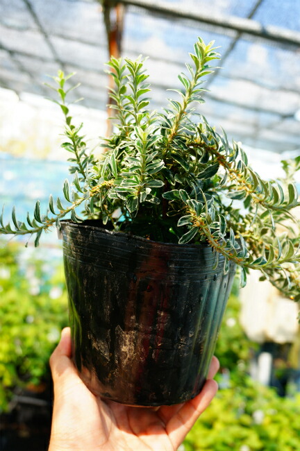 【ヒメマサキ 白斑入り葉品種】 葉の小さいマサキです。キンマサキや通常のマサキと比べ、葉が細かく、伸びも若干緩やかです。よく枝が込み美しい葉色。樹高も少し低めにおさまります。