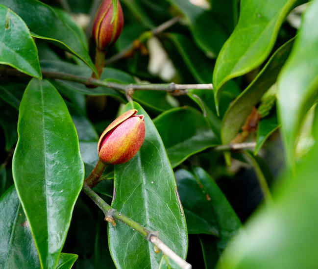 カラタネオガタマは中国南部を原産とするモクレン科の常緑樹です。渡来したのは江戸時代中期~明治初期頃とされています。寒さにやや弱いため、主に暖地の庭園などに植栽されてきました。「カラタネ」は「唐種(中国から来た種)」の意味で、日本に自生してきたオガタマノキと区別するために付けられました。