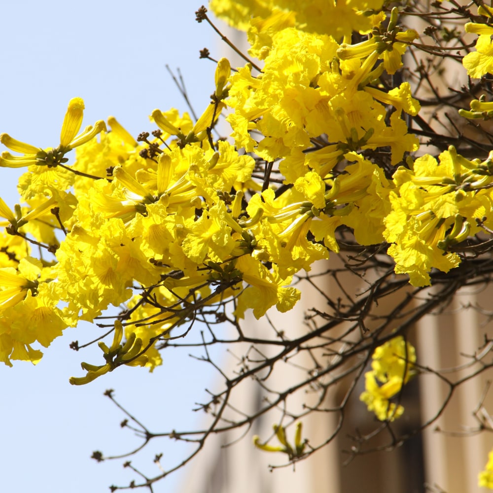 イペの名は、南米に住む先住民の言葉「イペ(皮の厚い木)」が由来とされています。元々は桃色の花が咲くパウダルコ をイペと呼んでいたようですが、現在は黄色の花が咲くコガネノウゼンをイペと呼ぶ場合が多くなっています。ちなみに、黄色系は一期咲き、桃色系は二季咲きだそう。沖縄でもよく見られ「イッぺー」とも呼ばれています。木材や薬材としても優秀なようで、原産地であるブラジルでは伐採が進んでいるようです。