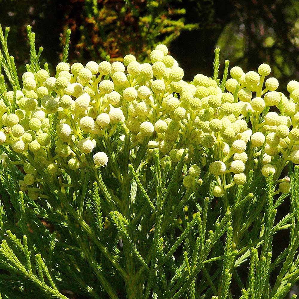 「バーセリア」は南アフリカ原産の常緑低木で、杉の枝のようなギザギザした葉がついた茎の先に真ん丸のつぼみがつく愛らしい植物です。クリスマスツリーとしても可愛らしい♪リースなどの花材としても人気です。