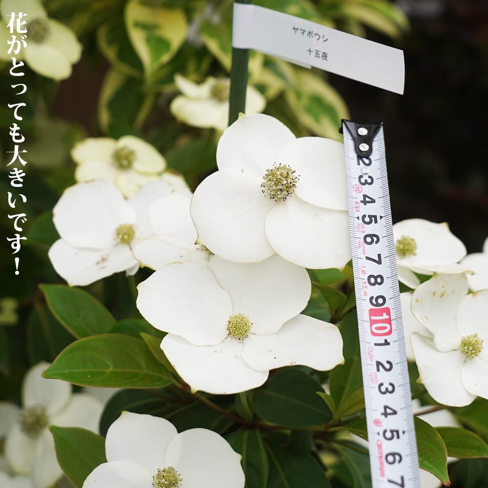 その丸い白い花がとても愛らしく、花付きがいいので、大きくなれば満開の花で見応えがあります!!十五夜は園芸種ではなく中国にある常緑ヤマボウシの原種の一つです。また花のサイズも約10センチと普通のヤマボウシよりも大きな花です。まれに5cmくらいの小さな花しか咲かないことがあります。