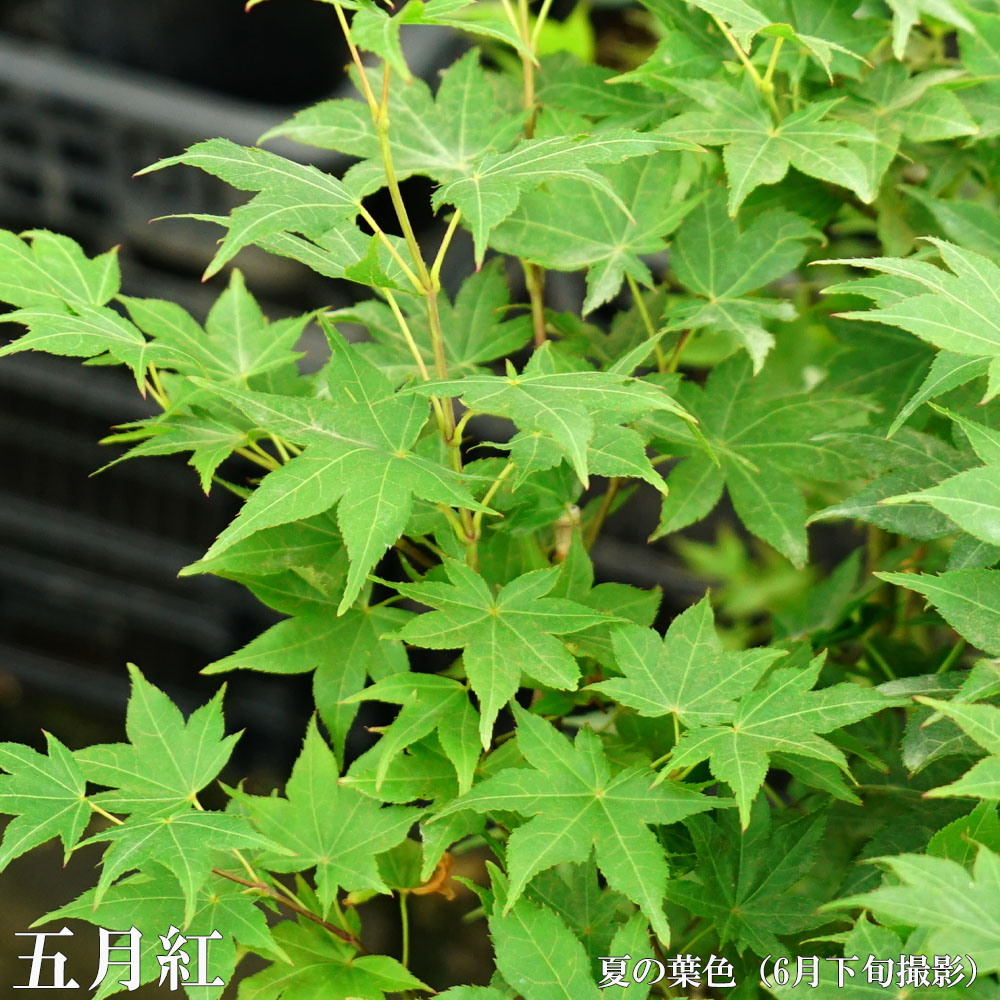 五月紅(さつきべに)。芽吹きは4月下旬とちょっと遅く、黄緑色の葉地に葉先(爪部)に紅がさします。5月中頃からは爪部の色が薄くなり、葉地が濃い緑色に変わる頃には爪の斑はほとんど見られなくなります。秋には葉の全面が濃い赤橙色や赤黄色、中間色などに紅葉し、四季を通じて楽しめます。中でも5月の芽だし時と11月の紅葉が特に見ごろです。春の新芽の素晴らしい色と、夏のみずみずしい葉、紅葉もすばらしく、魅力満点のモミジです。