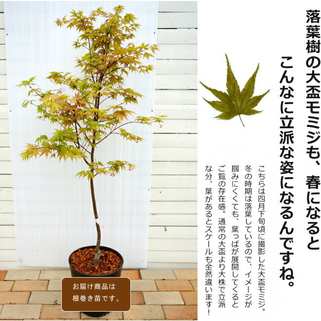 商品は根巻き苗です。 根巻き部分を含め高さ約1.5m前後。 落葉期は葉はついてませんが、春に芽吹きます。植え付け時は根を包んでいる麻布や麻紐ははずさずにそのまま植えてください。麻紐や麻布は土中で分解されて自然に帰ります。