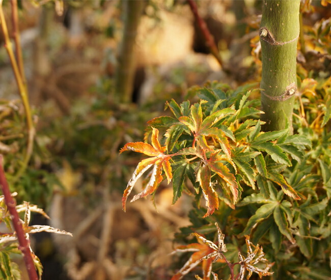 葉に切れ込みがあり、葉が薄めのカエデ類は夏の高温で葉を乾燥して茶色くさせてしまうと秋の紅葉が楽しめなくなります。鉢植えは夏は水切れに注意すること。もし、葉が茶色くなり始めたら、8月下旬まででしたら思い切って葉をむしってやります。その頃までは葉をむしって坊主にしても9月ごろから芽吹きますが、9月を過ぎると芽吹かずに紅葉も見れなくなります。夏は西日があたりにくいような場所で育てるのがポイント。また、農薬散布の薬害で葉が痛むので、希釈倍率を薄めにし、気温の高い時間帯の農薬散布は控えます。