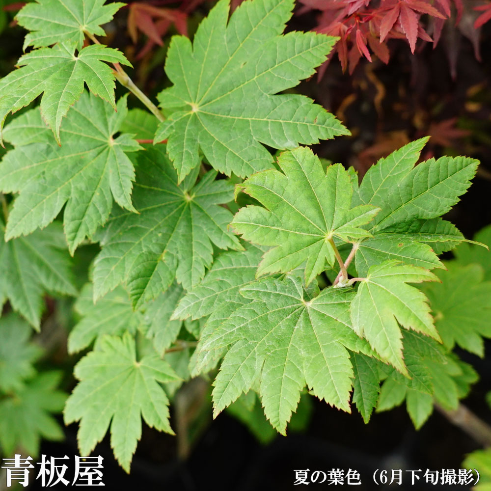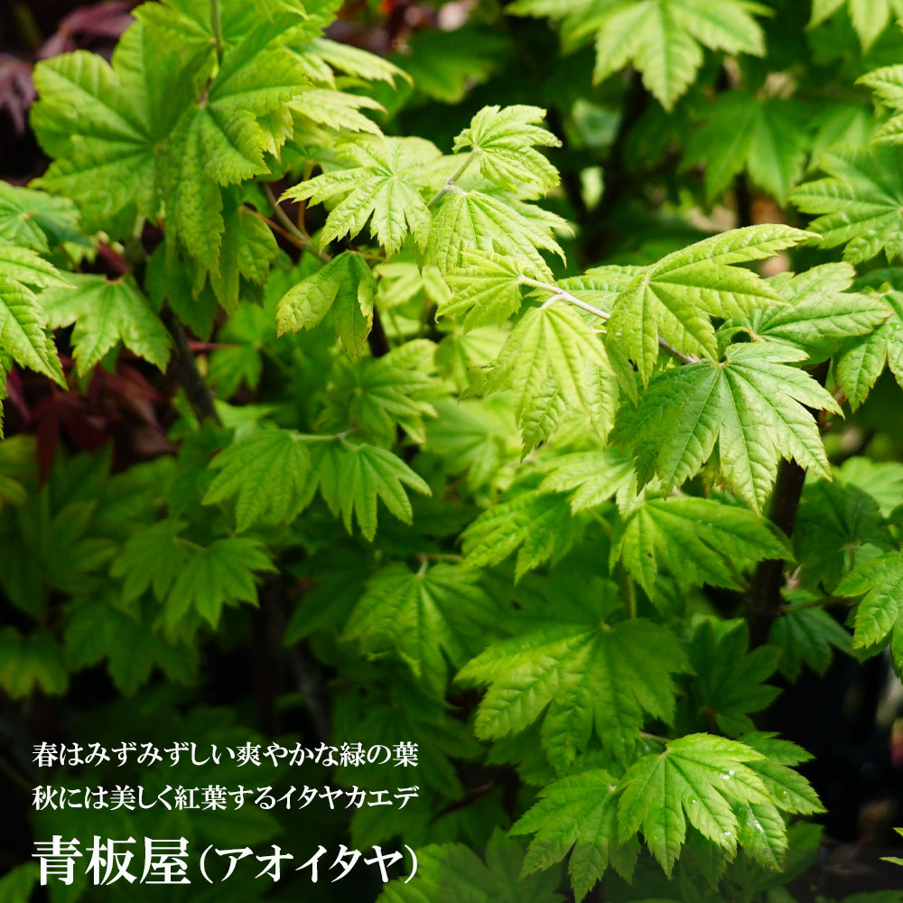 青板屋(アオイタヤ・あおいたや)はかわいらしい赤ちゃんの手の平みたいなずんぐりした葉です。みずみずしい葉色は夏を爽快にさせてくれます。芽吹きは葉先にピンクが入ったり、芽出しの色は変化します。展葉すると黄緑で、次第に濃緑に変化、秋は黄色やオレンジ、真っ赤に紅葉してカラフル。条件が良ければ真っ赤に紅葉します。秋の紅葉は個体差や環境で微妙に異なります。
