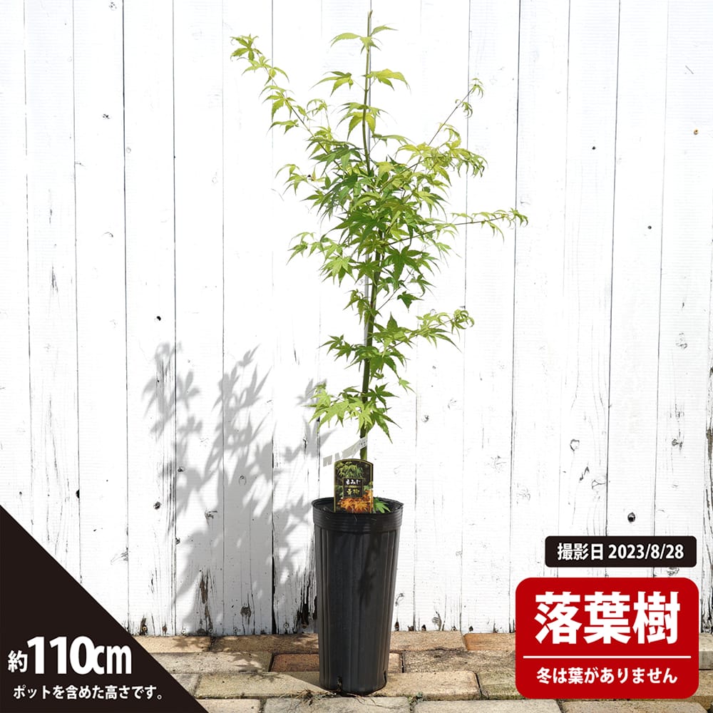 芽吹きから開葉まで黄緑色。若葉が新緑の季節に良く映える涼しげなモミジ。軸も緑枝です。春の葉はとても綺麗な緑色で徐々にしっかりとした濃い色になります。秋は黄色に紅葉します。若い苗木のうちは夏場に多少葉焼けが起きる場合もございますが、大きくなれば無くなります。枝が緑色で美しいことから青柳(あおやぎ)と名づけられました。別名は右近です。