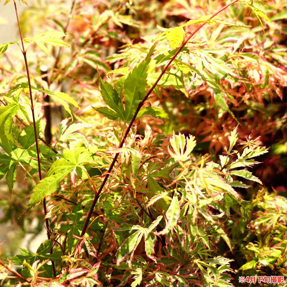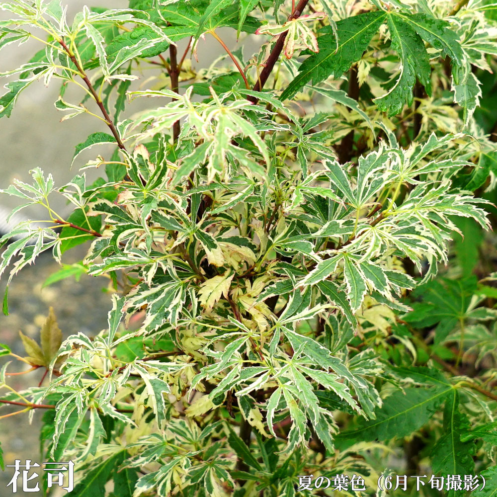 花司(はなつかさ)はイロハモミジ系の斑入り品種です。紅色(後に白色に変わる)の覆輪斑が入る綺麗なモミジです。若葉の黄緑の葉に鮮やかなピンクの斑が入りとても美しいです。夏場には葉地は白緑色に変わり、斑色も淡い黄色~白色に色褪せてきます。秋は美しく紅葉します。