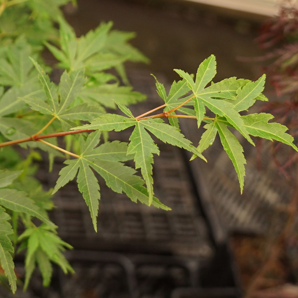 瑞穂紅(みずほべに)は裂片の先が尖った葉が特徴です。春の芽吹きは淡い赤ピンク色で、徐々に赤橙色の葉地に主脈が黄色く走り美しい葉色を楽しめます。 葉色が赤緑~黄緑色~薄緑色になります。夏には緑一色に変化するので一気に涼しげなモミジになります。秋には再び真っ赤~赤紫色に紅葉し、落ち着いた色合いが素晴らしく美しい。