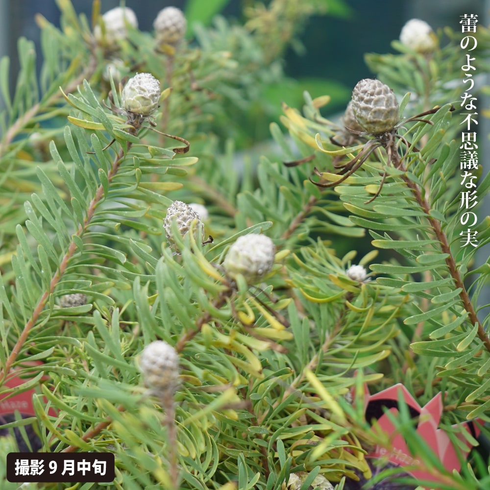 南アフリカ原産の暖かな地域の植物ですので、寒さはちょっと苦手。寒冷地では鉢植えで育ててあげましょう。成長すると1~2mにもなり迫力のある樹形が楽しめます。苞葉(蕾を包むように変形した葉)がまるで花のような美しさを見せる珍しい植物で、長くその姿を楽しめるので切り花にも最適です。実際の花はその中心にある松ぼっくりのような部分です。ドライフラワーやスワッグにしても素敵ですね。日本で販売されているものはオーストラリア産のものが多く、日本ではまだまだ珍しい庭木で、植えれば注目間違いなしです。実は雌株と雄株があり、色や形が異なり雄株はより色が鮮やかで、雌株は花持ちが良いそうです。