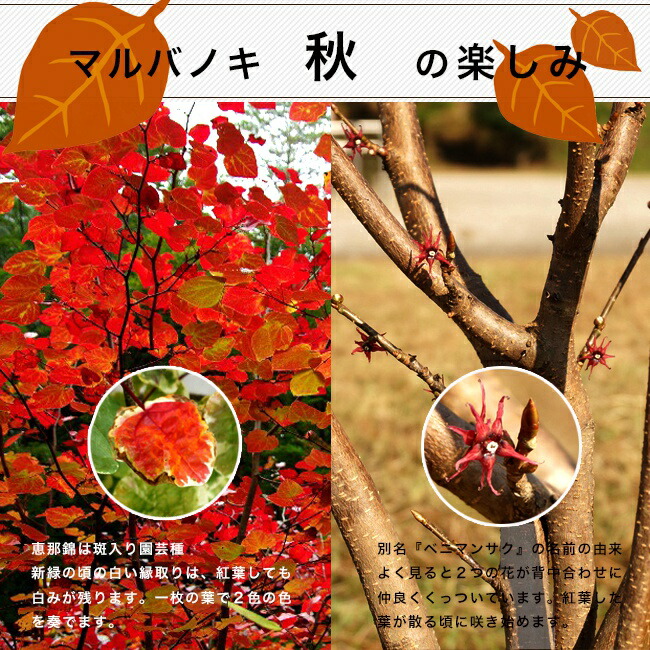 マンサク科マルバノキ属の落葉樹です。丸みを帯びたハート型のような特徴的な葉をしており、秋には葉が鮮やかな赤色に紅葉します。また、葉が紅葉(落葉)する11~12月頃、マンサクのような形の、赤く小さな2つの花が背中合わせに咲きます。別名の「紅万作 ( ベニマンサク )」は、この花が名前の由来です。