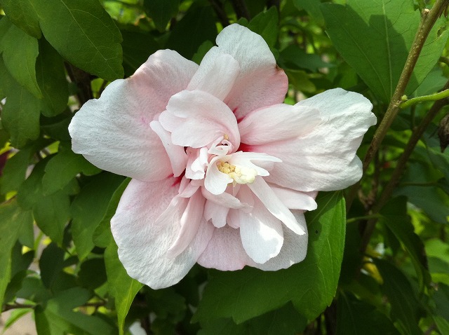 夏を涼しく感じさせてくれるやさしい花色です。白~薄ピンクの半八重咲きです。