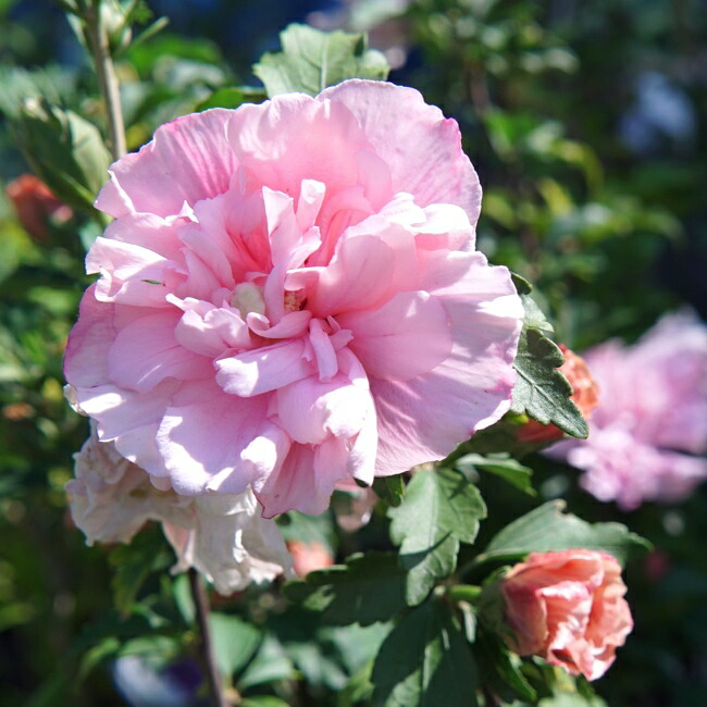 優しいピンク色の花が魅力的な、ダブル咲きのムクゲです。花径は10cmほどの大輪で、花つきがよく、次から次へと花を咲かせてくれます。